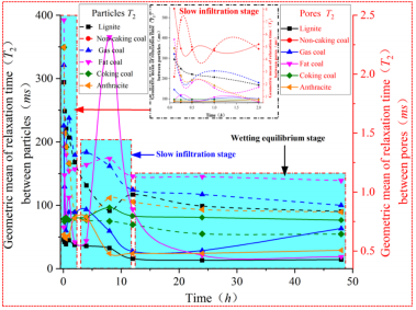 图 2. 表面活性剂 (JFCS) 润湿不同煤体过程中,晶间和孔隙几何平均 T 值的分布。